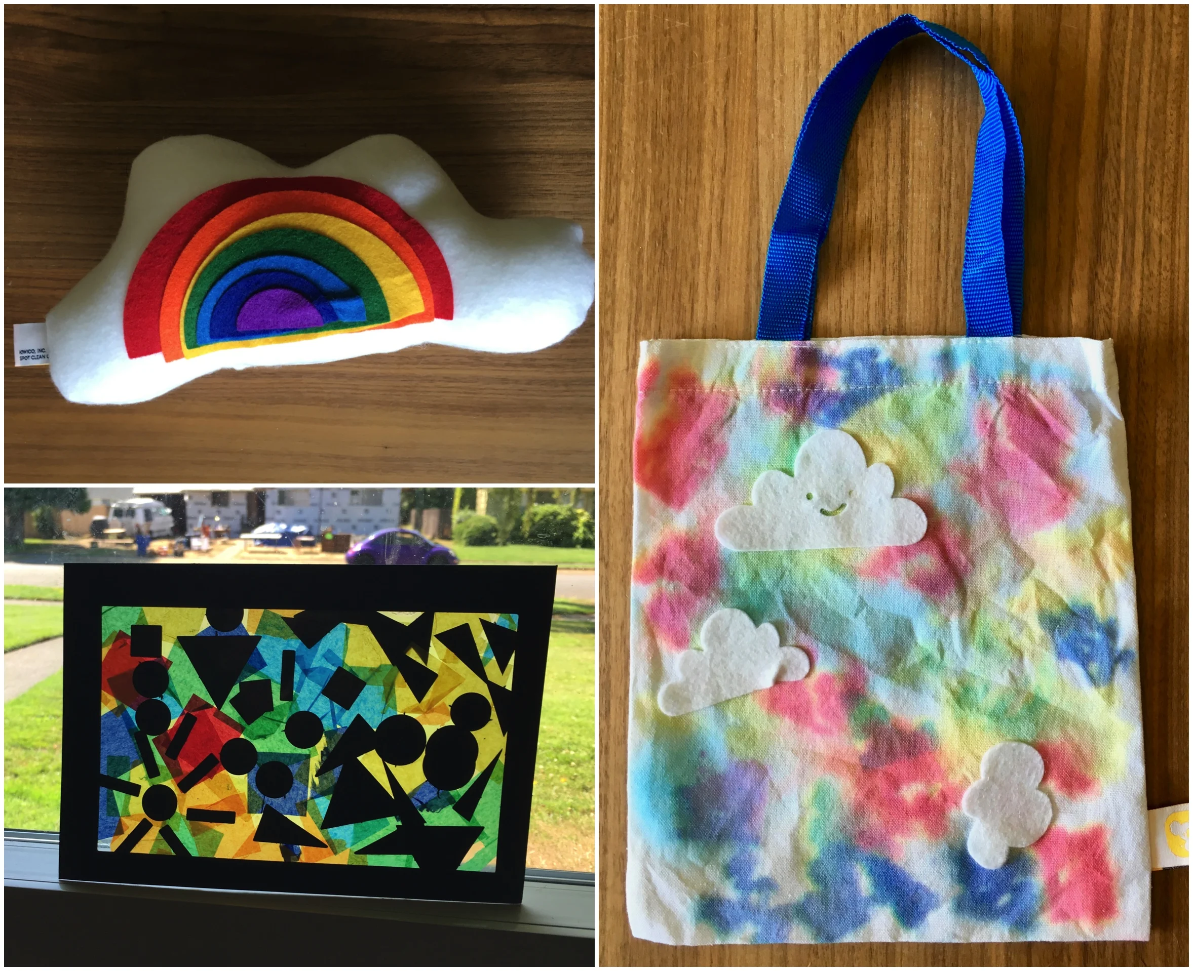 The rainbow bag involved getting the bag wet, placing square color pieces on it, then using the dropper to get the squares wet. It dried overnight and then we placed felt clouds on the bag the next day.