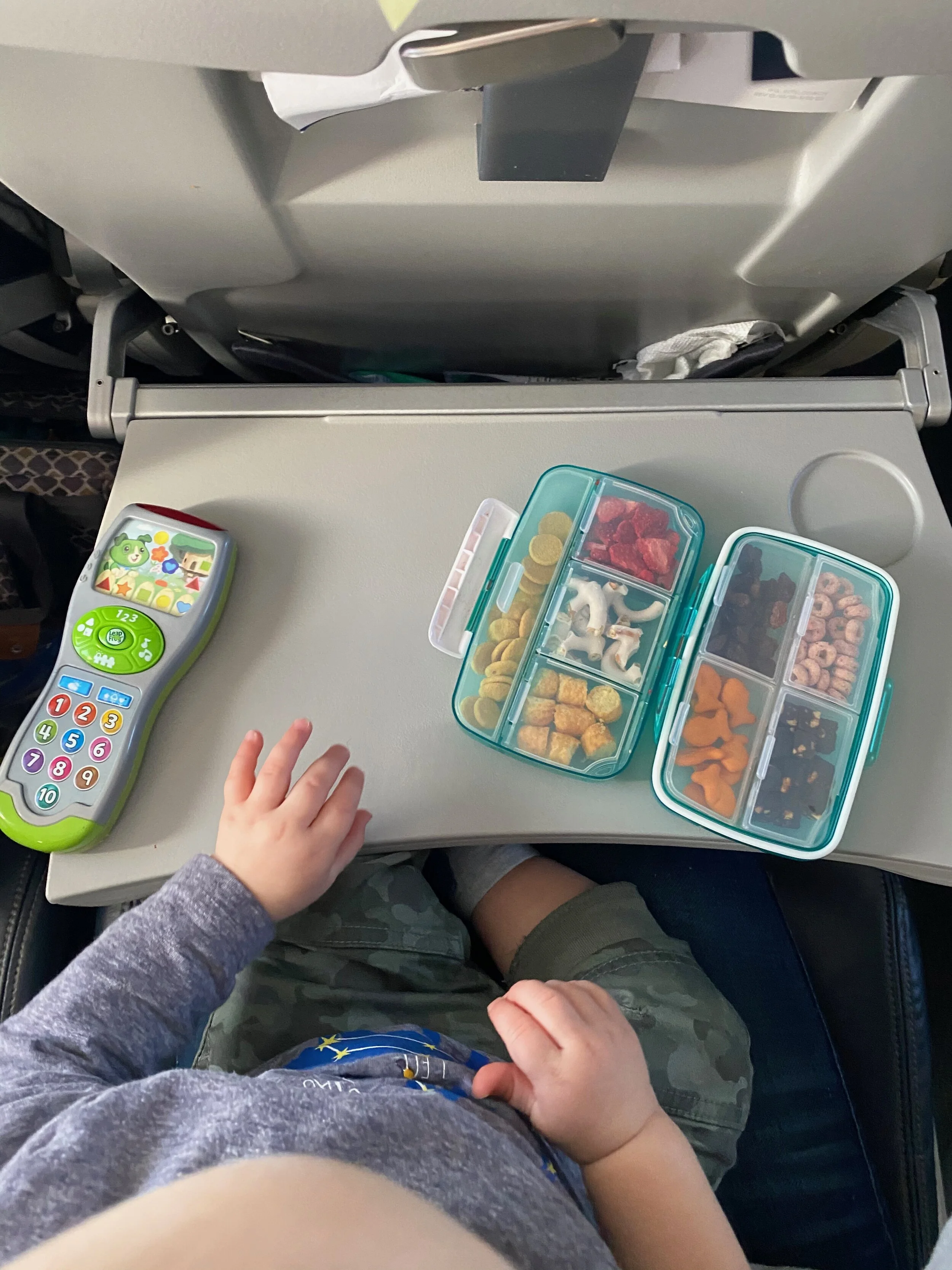 I got this idea from my friend Kristen Bell. Okay, she’s not my friend but I follow her on Instagram. One of her posts led me to ‘Kids Eat in Color’ who posted the airplane bento box idea. Brilliant! I took forever to find the right box - I wanted something that had individual lids to each square and large squares to fit a few pieces of food. Caleb (4yo) was into the snacks and Wesley (14mo) was into opening/closing the lids. I maybe should have gotten two since there were a few struggles of “I want it” but overall it worked great. Oh, and the foods I put in there: creamies, freeze-dried strawberries, broken up yogurt pretzels, goldfish, raisins, cheerios, pieces of a date bar (like a Lara Bar), and cut up puffs (like Hippeas), and blueberries.