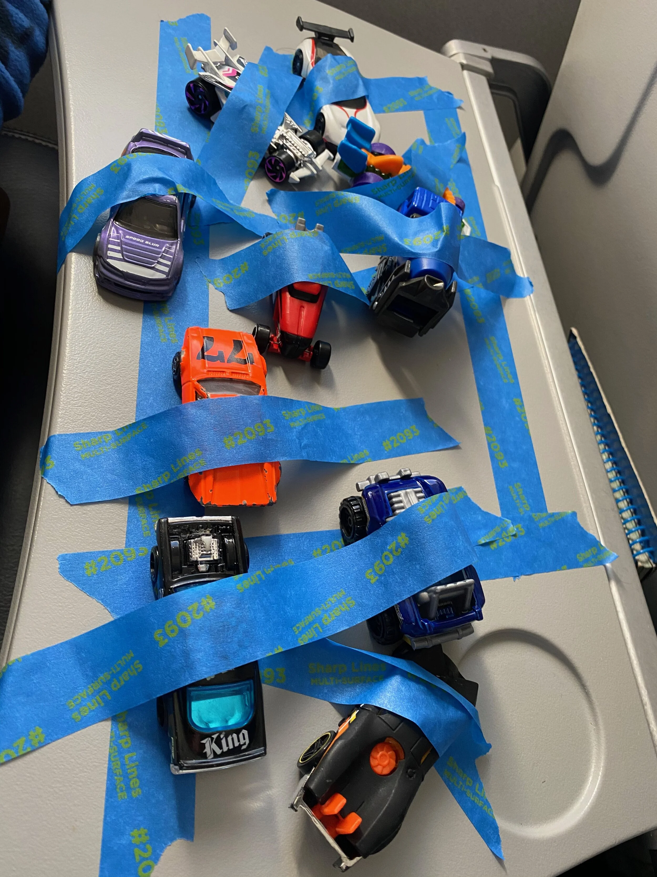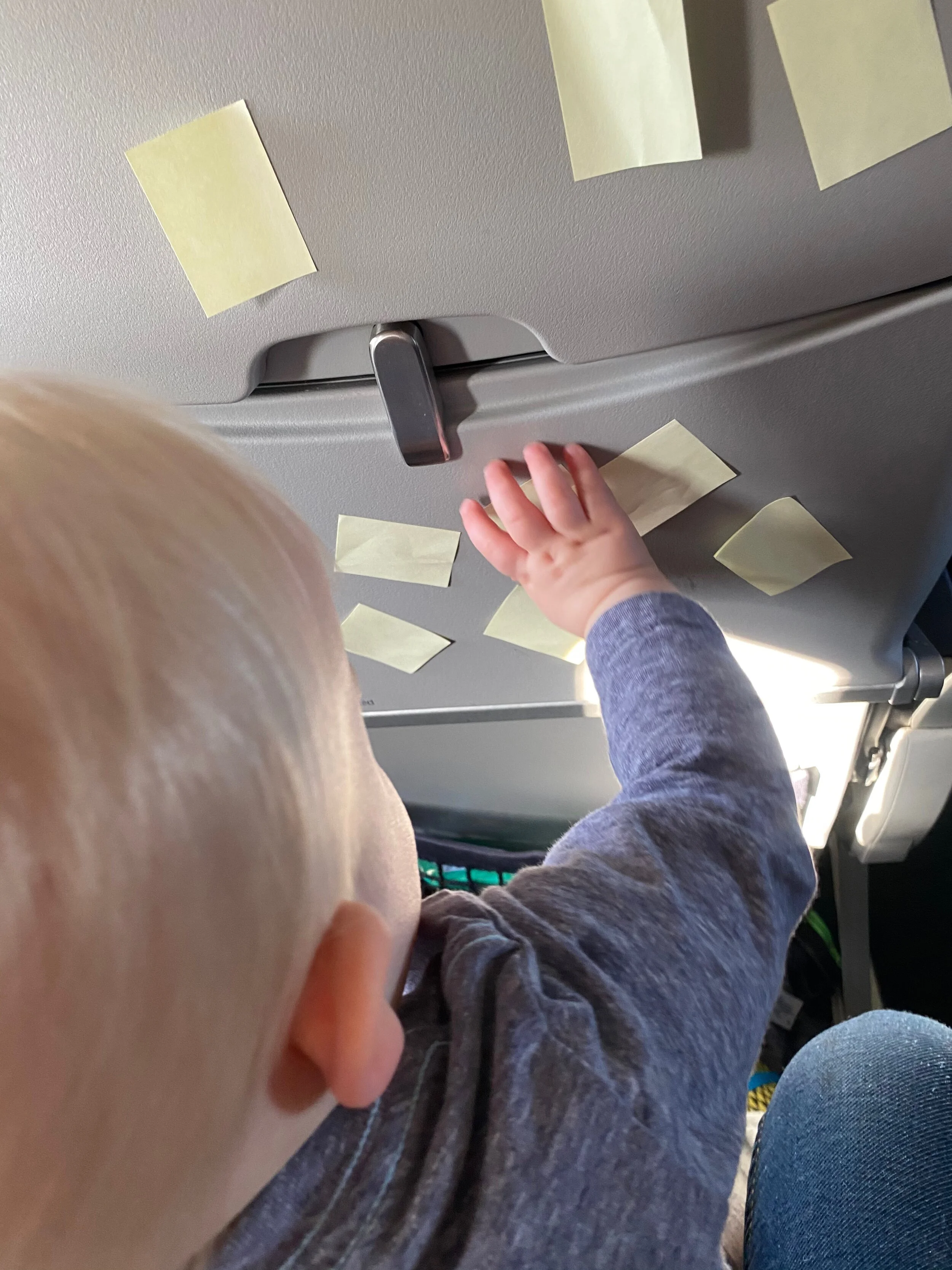 Also known as painters tape. I love blue tape. I use it all the time but it didn’t dawn on me to bring it on the airplane until I posted on Facebook for airplane activity suggestions. What’s great about it is that it doesn’t leave any damage or sticky residue when you take it off. Caleb (4yo) loved trapping all his Matchbox cars to the tray table, and Wesley (14mo) liked to take them off. I also just ripped little pieces for Wesley to tinker with. I thought I might make roads with it for the cars, but we never got to that. Trapping them was enough, apparently.