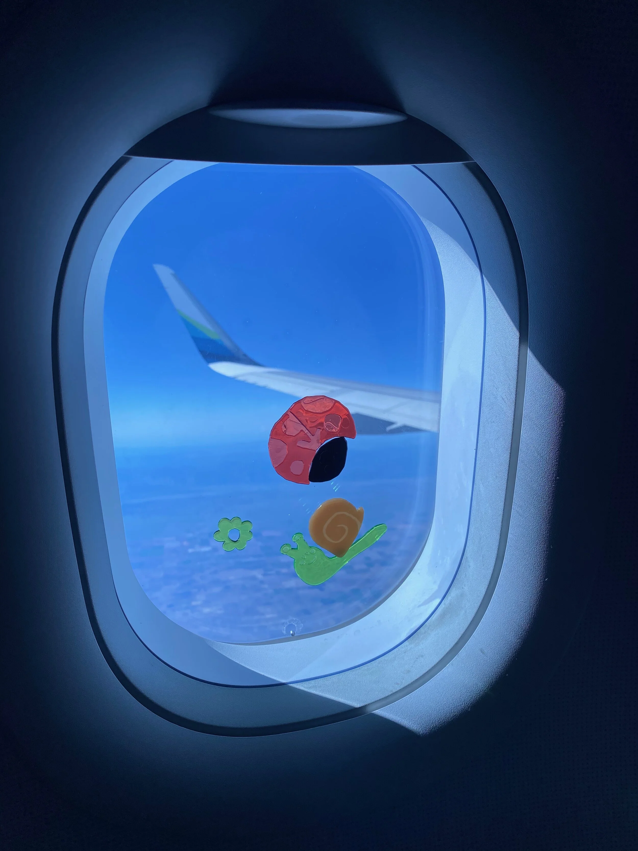 I got a sheet of spring gel window clings in the seasonal area at the front of Target for $1. Best $1 ever. Caleb (4yo) was more into it then Wesley (14mo), although Caleb did have the window seat and they don’t work on the tray tables. Also, Caleb hogged them so maybe Wesley would have been more interested if he had more of a chance. #brothers. On and off they went and making different creations with them. I had heard of this idea in the past and always blew if off, glad I didn’t this time!