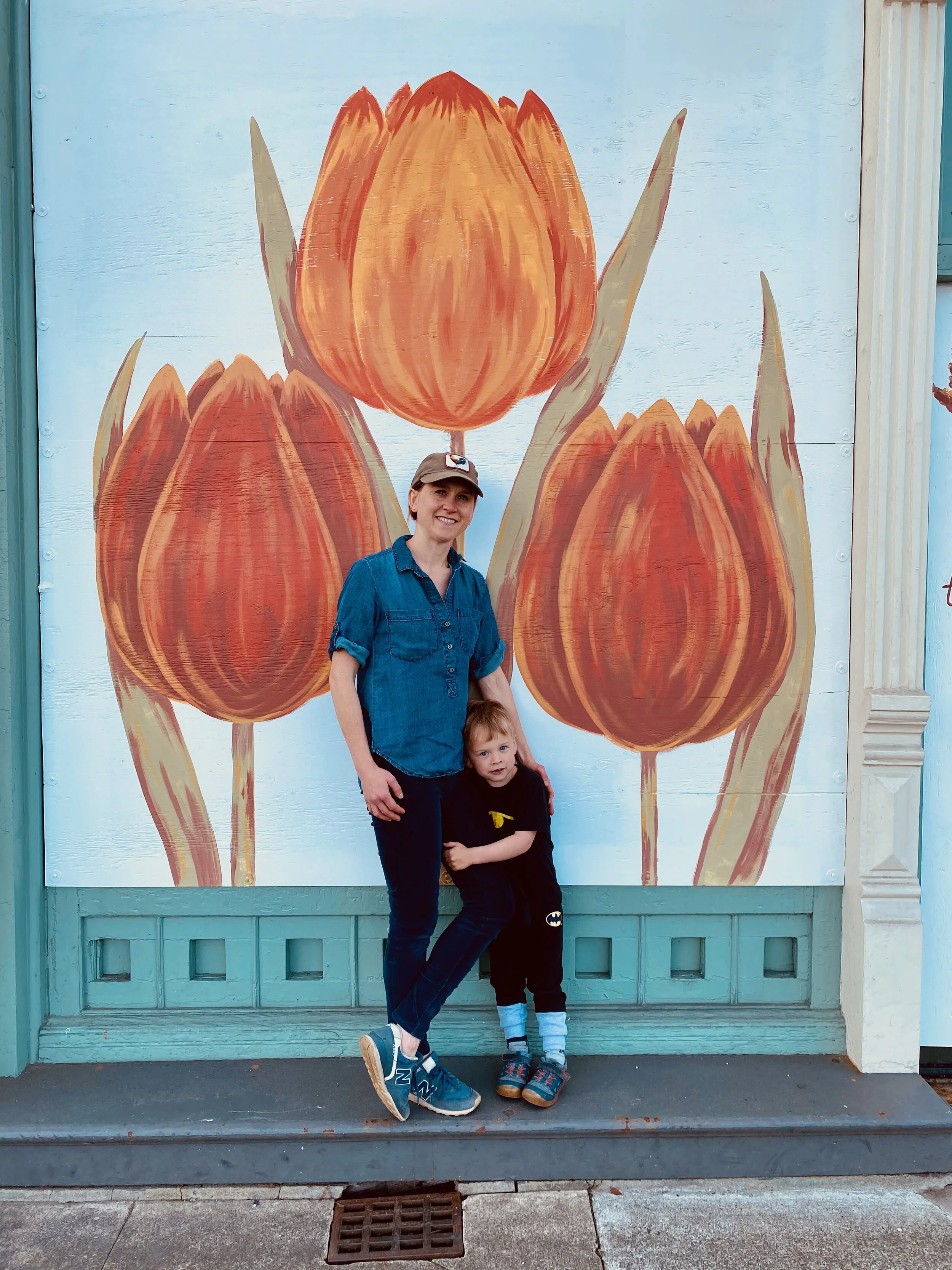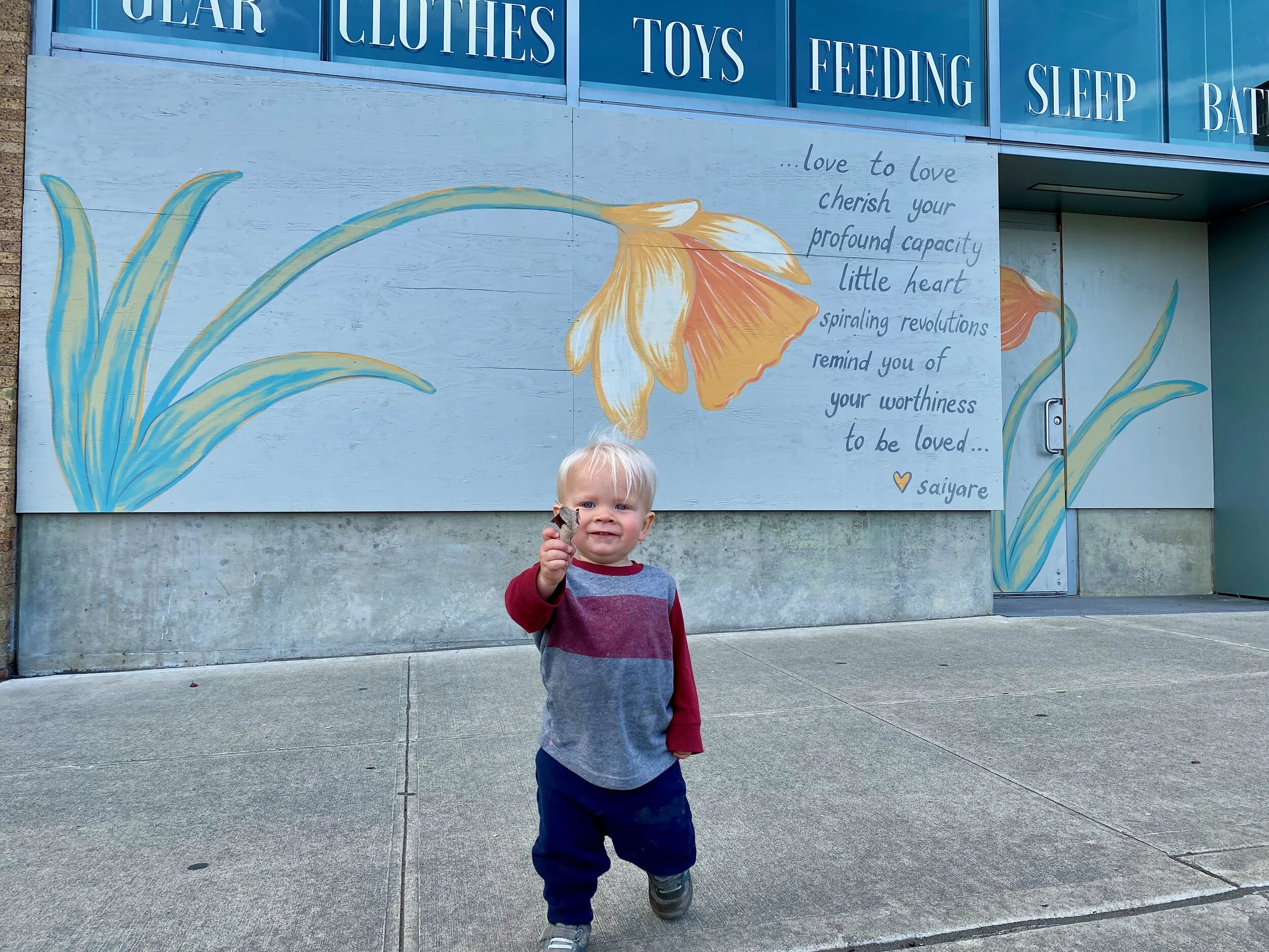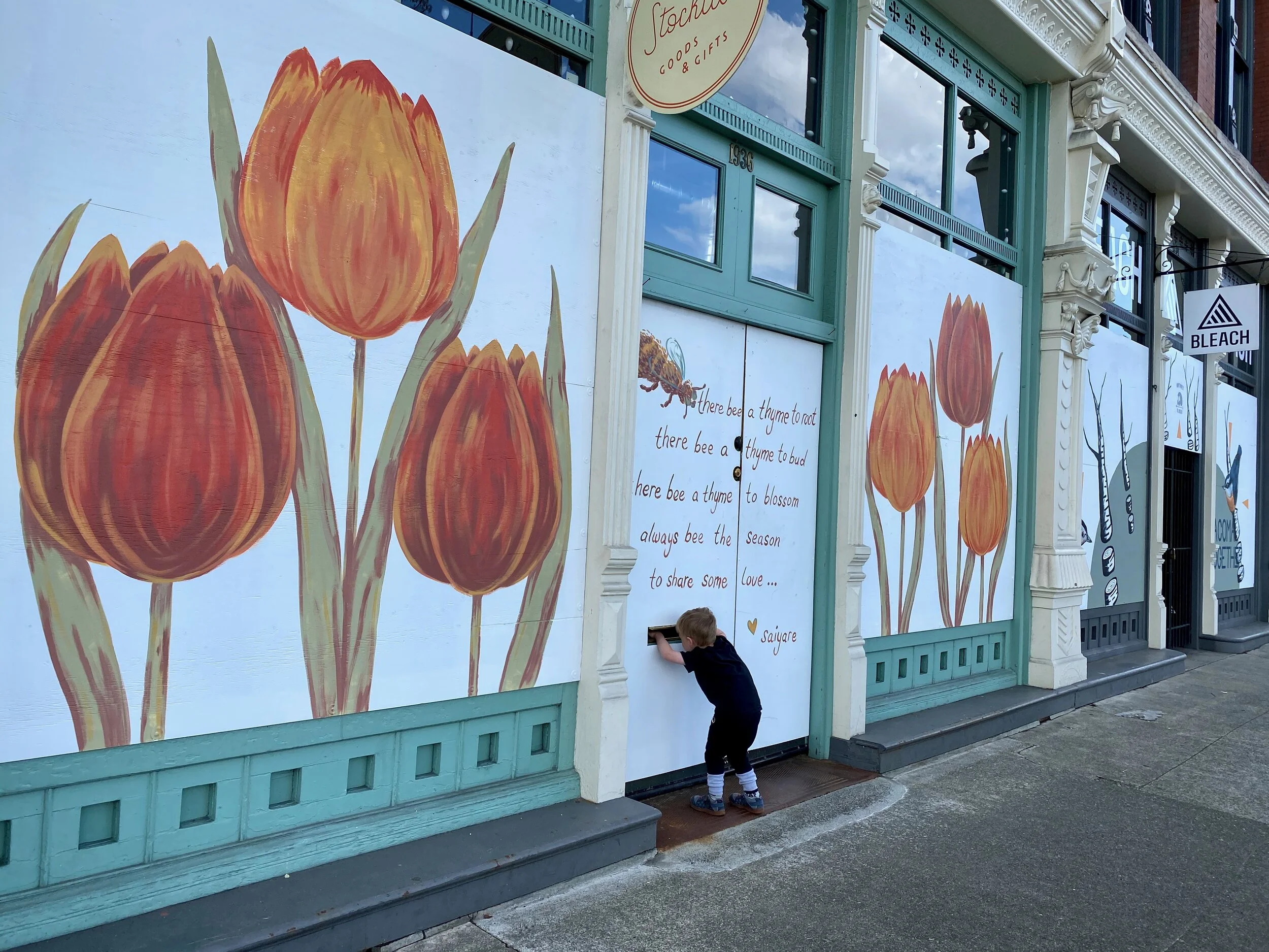 We just did a small walk where most of the murals are located - we parked near Harmons on Pacific Avenue then walked that stretch of stores until Zeek’s Pizza. The art was lovely and then there were tulips blooming and the sun was shining (oh, and we so the light rail trains, found puddles, and some leaves…you know, super cool things). It was a short, beautiful walk and totally refreshing to do something beyond the neighborhood.