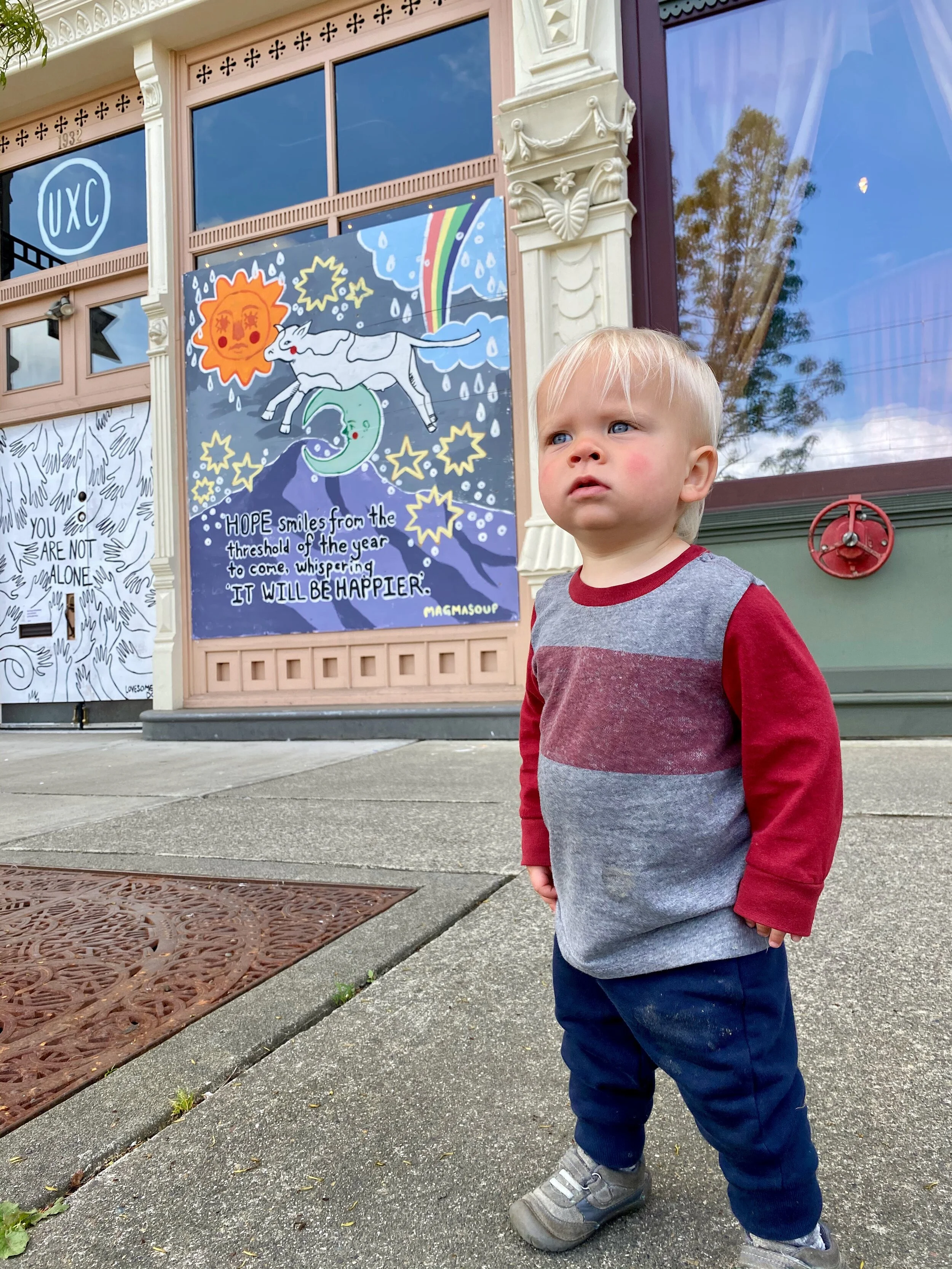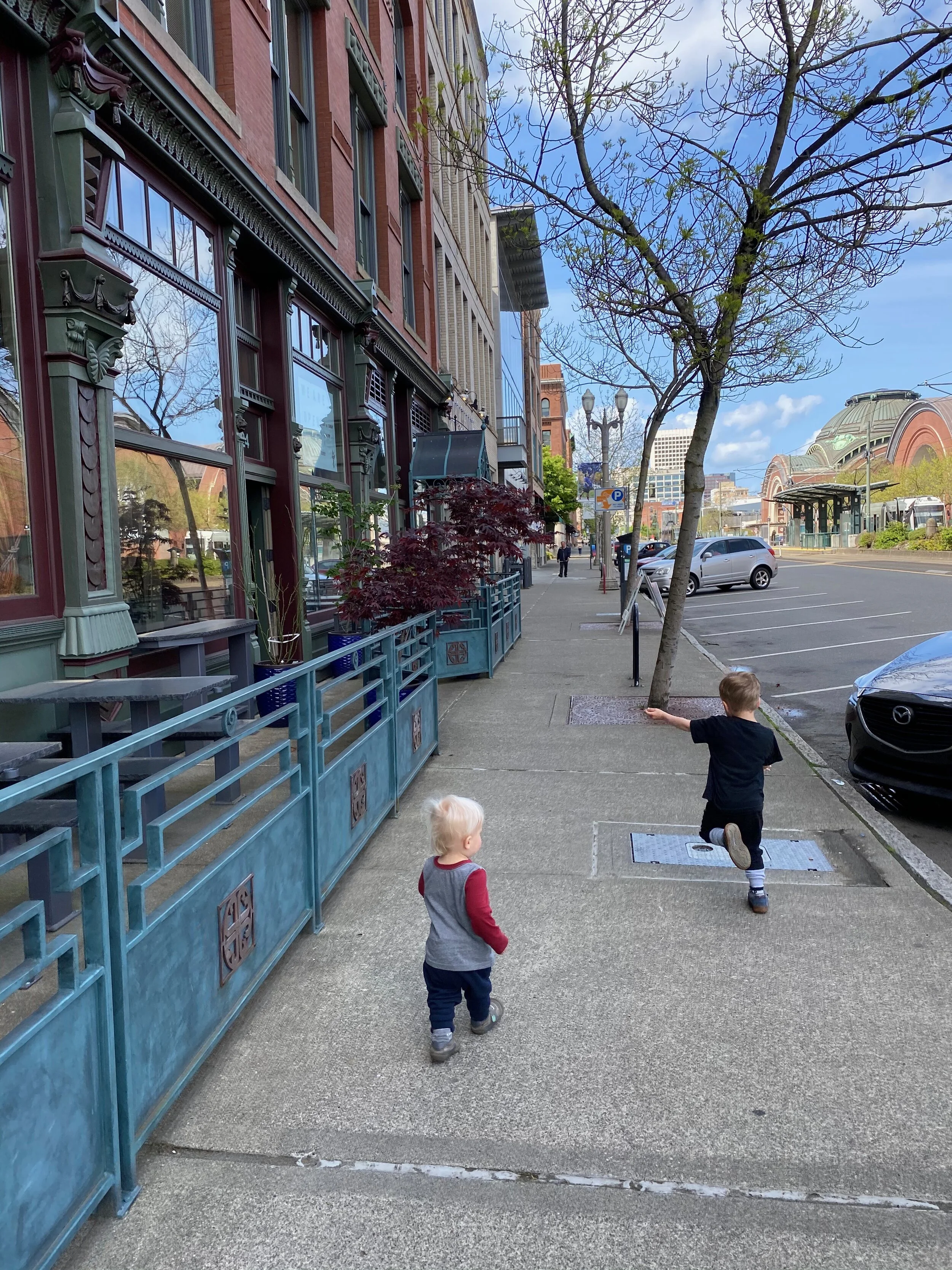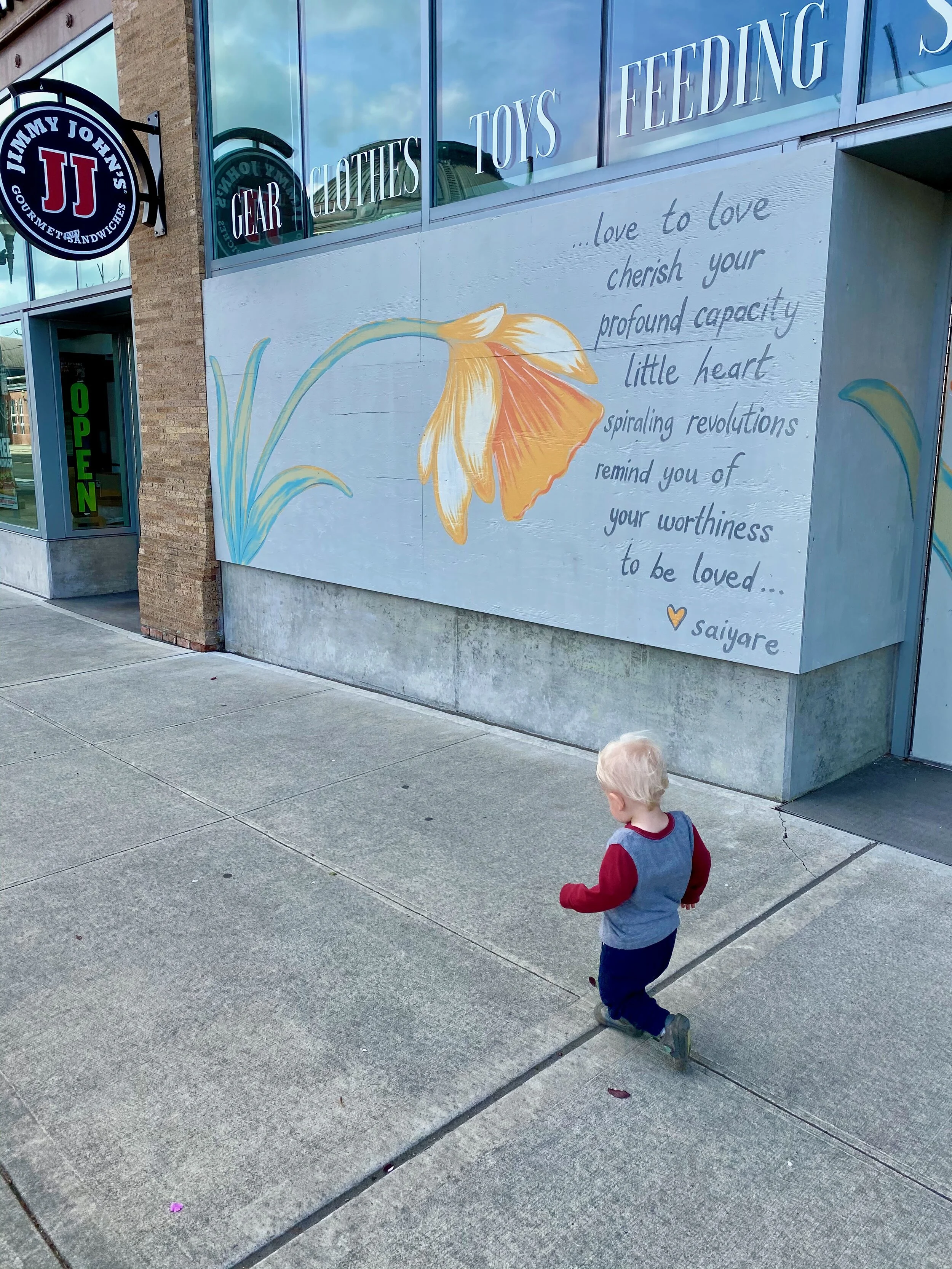 We just did a small walk where most of the murals are located - we parked near Harmons on Pacific Avenue then walked that stretch of stores until Zeek’s Pizza. The art was lovely and then there were tulips blooming and the sun was shining (oh, and we so the light rail trains, found puddles, and some leaves…you know, super cool things). It was a short, beautiful walk and totally refreshing to do something beyond the neighborhood.