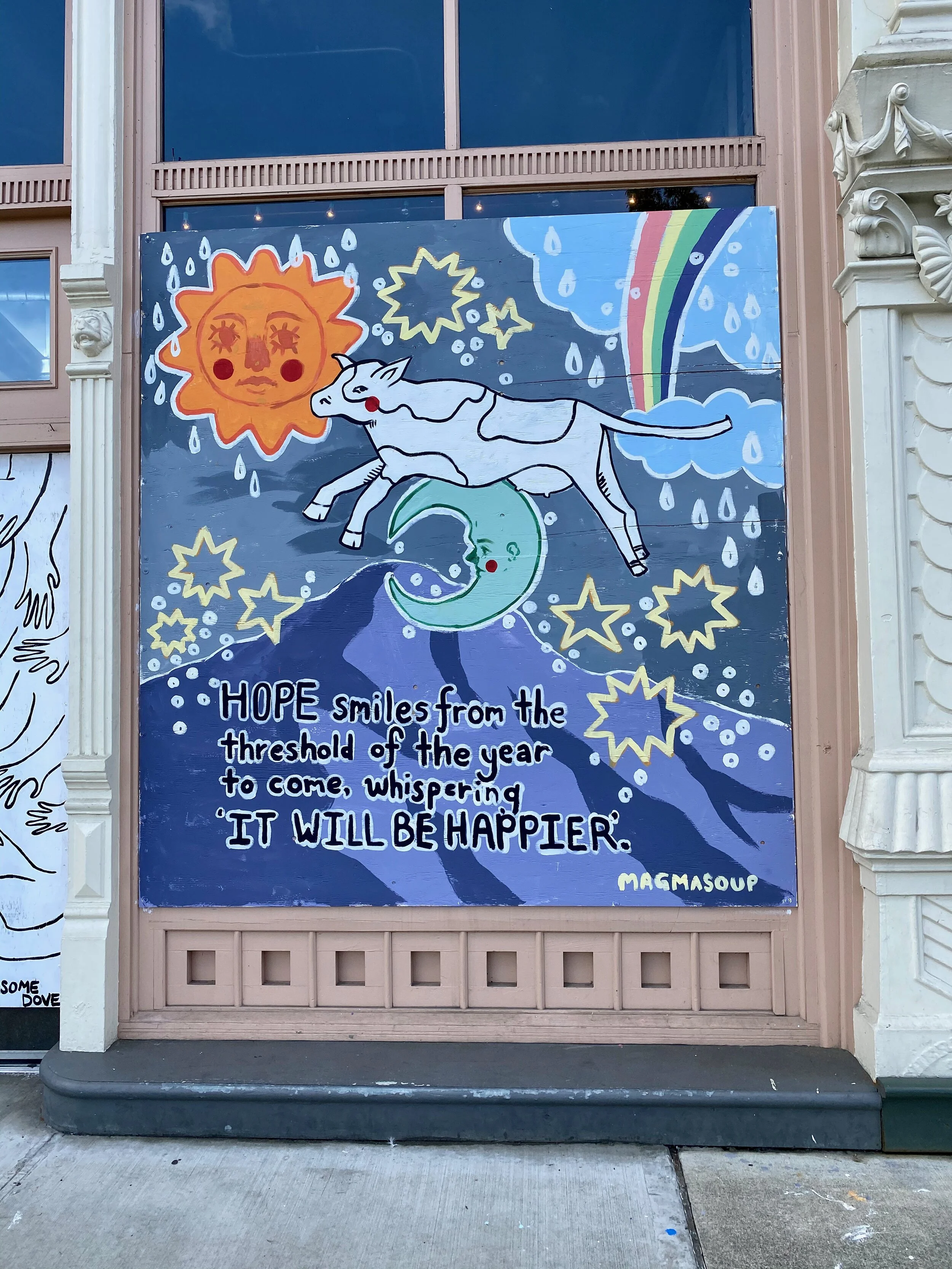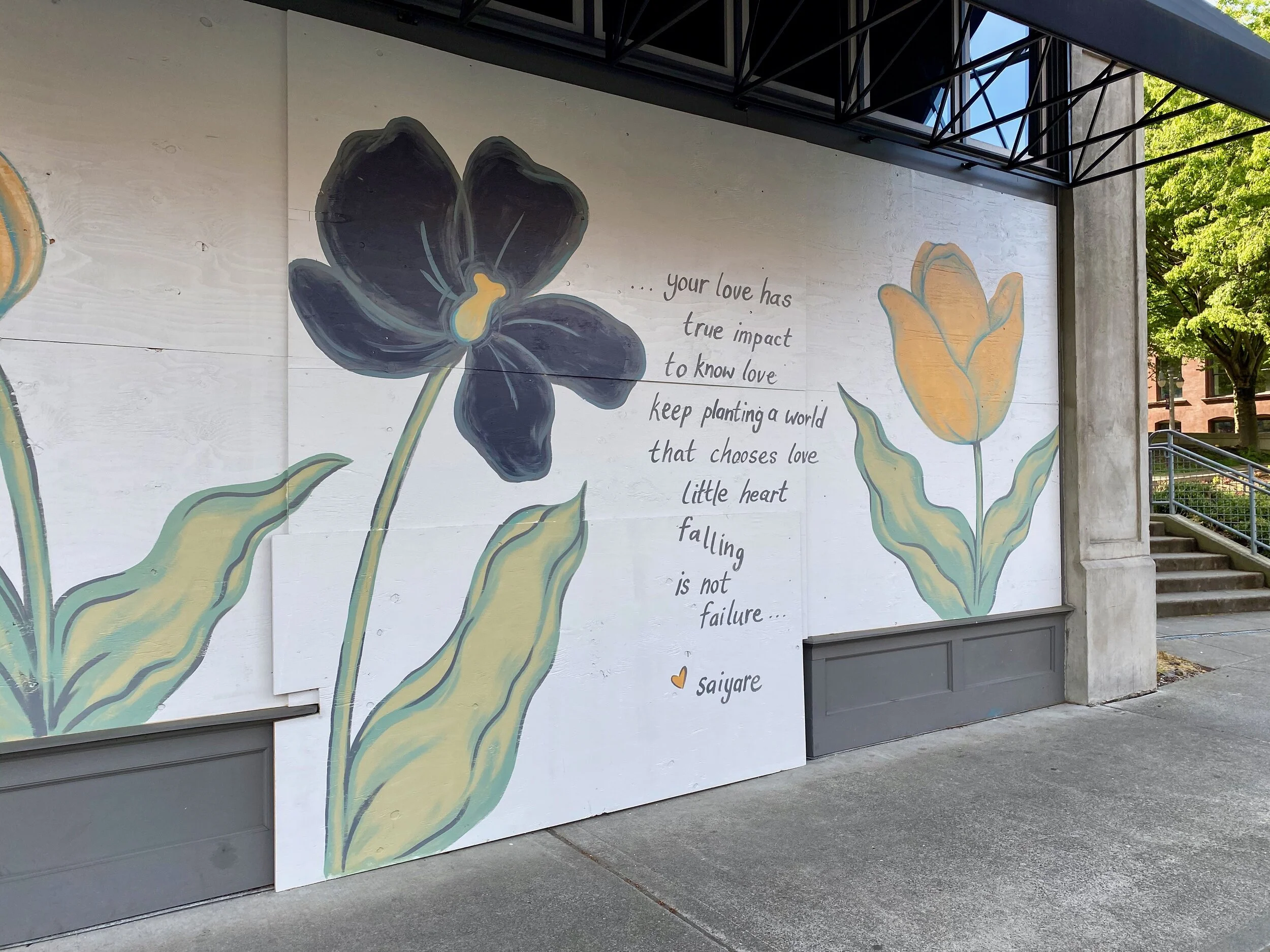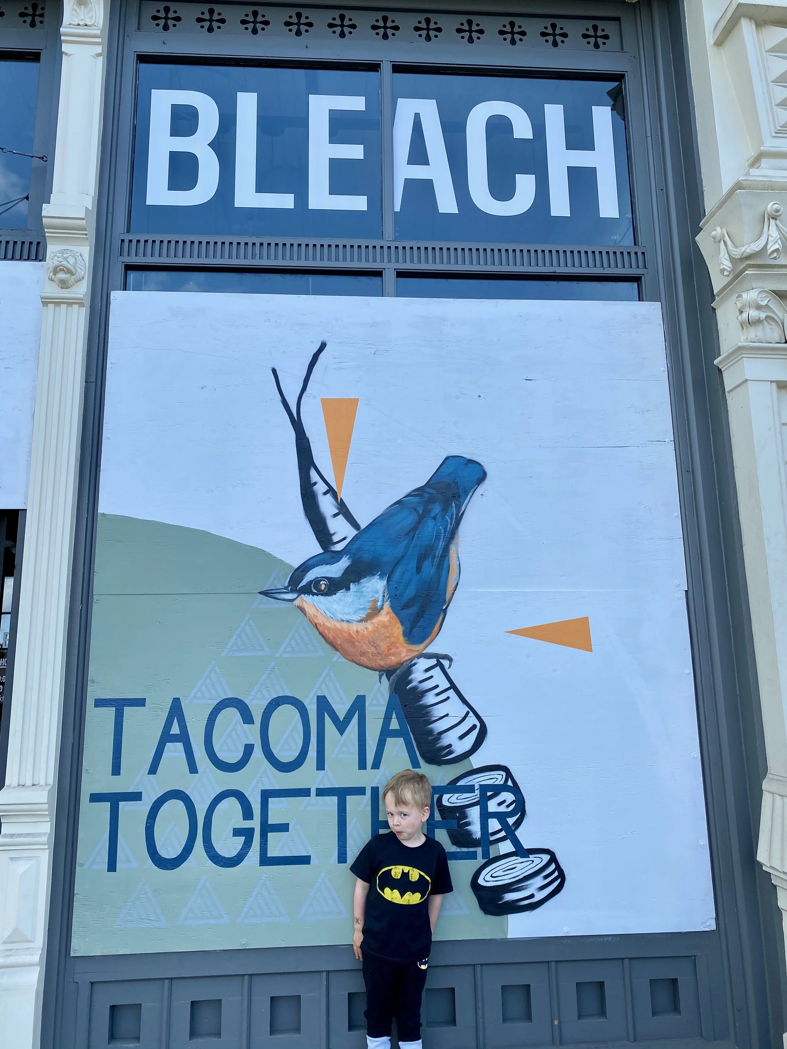 However, we’re all in this together and I feel lucky we have a strong community here in Tacoma. One thing that was encouraging lately was all the murals in downtown Tacoma. Many stores had to close down during the quarantine and to keep their stores safe, the store owners boarded up their storefronts with plywood. Rather than having plain plywood, local artists painted murals on the plywood as part of a Rapid Mural Program. And now there is a small art walk on Pacific Avenue (and a few other places downtown). We took a walk on Saturday to check it out and thought I’d share our photos.