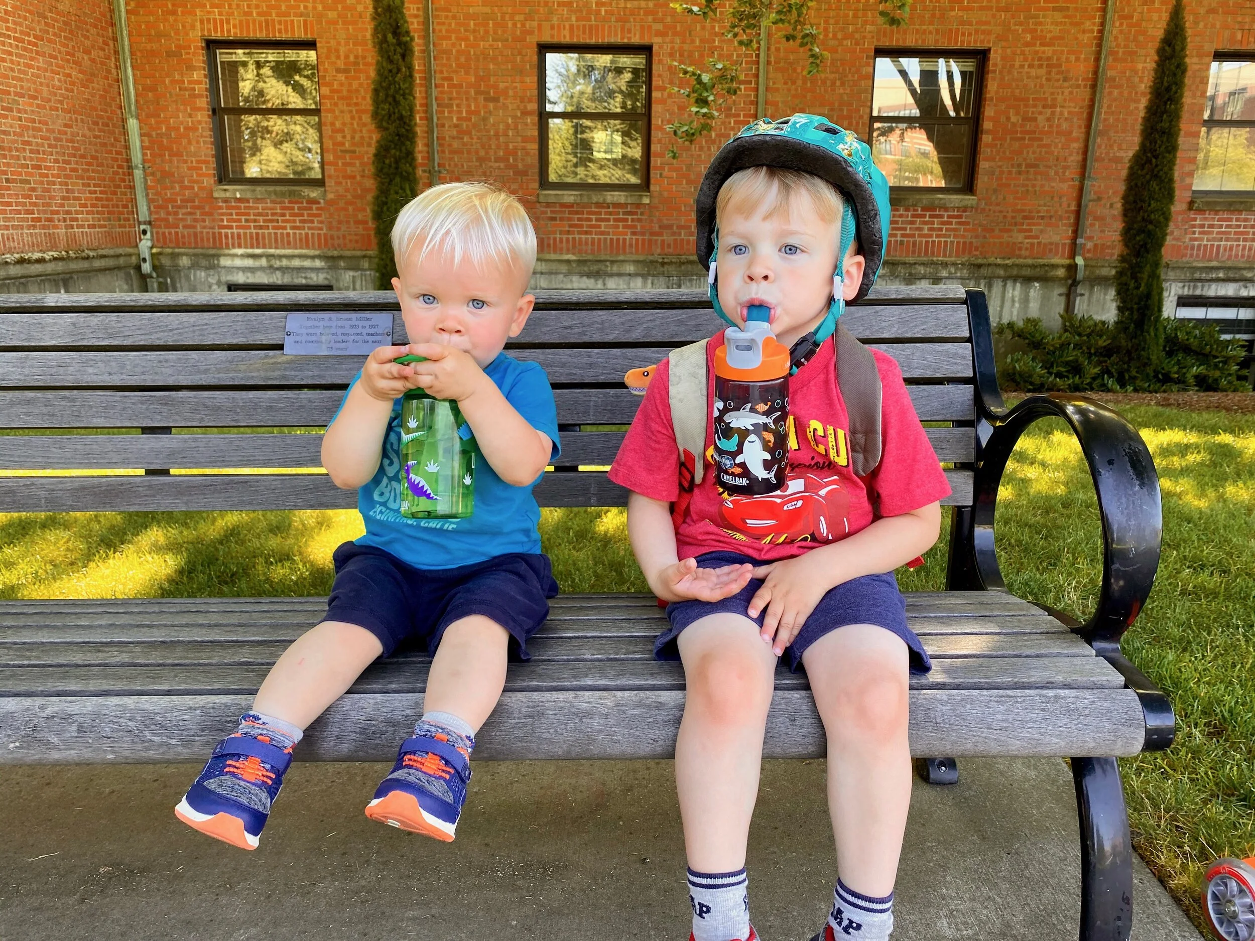 School is not in session right now, so it’s nice to walk around the campus. My 4-year-old usually brings the scooter while my 19-month old walks (he LOVES to walk). We will bring a snack sometimes and sit on the bench or in the grass. It’s such a beautiful campus!