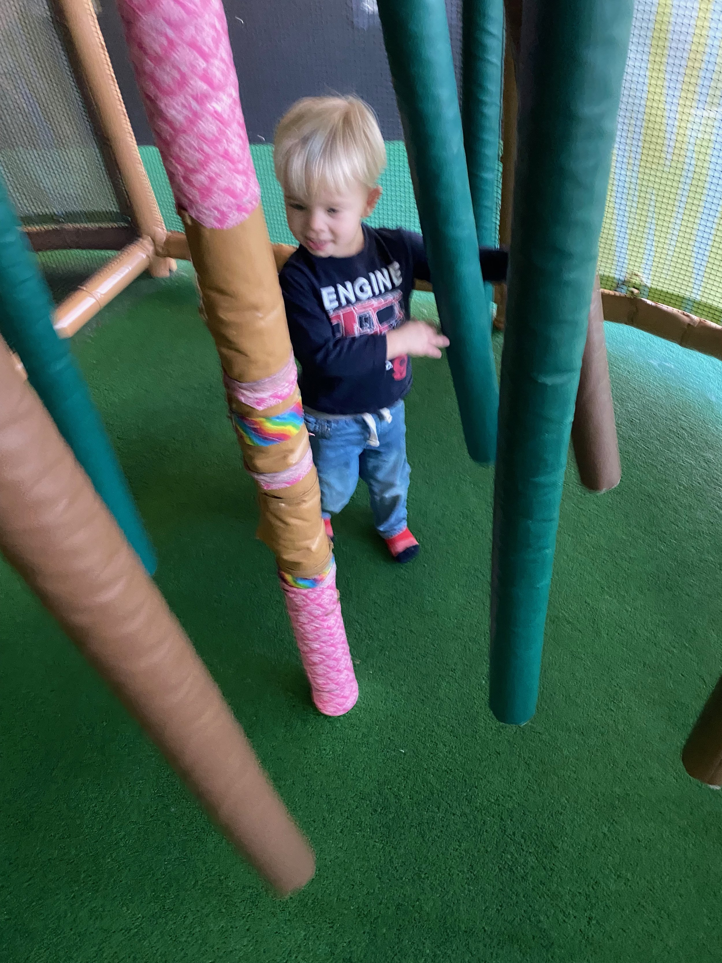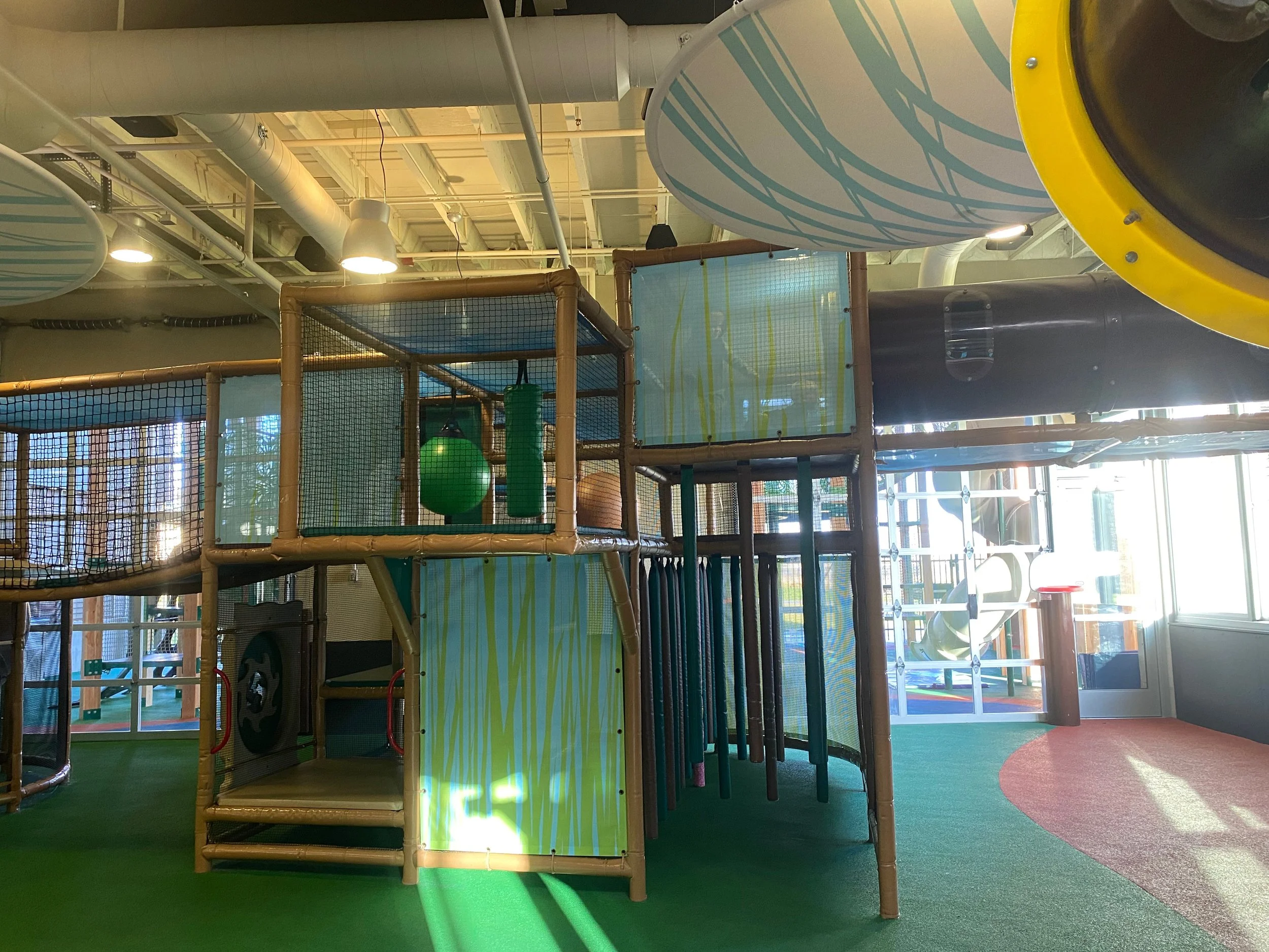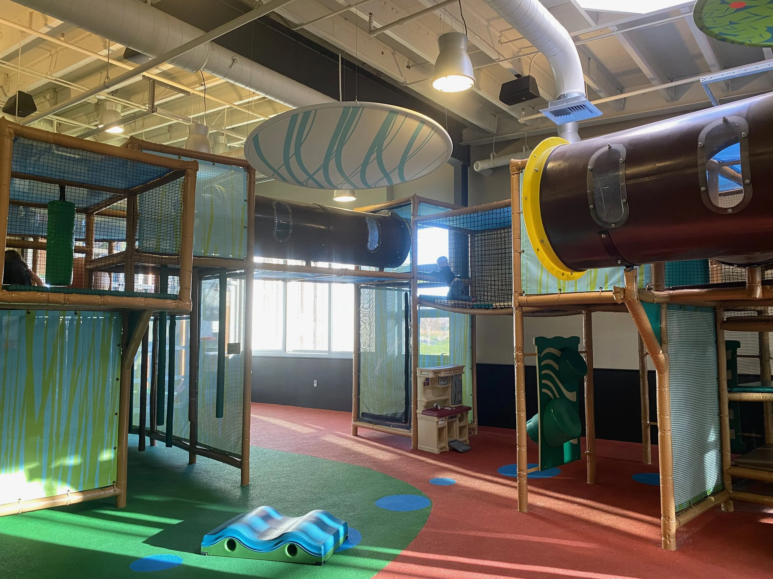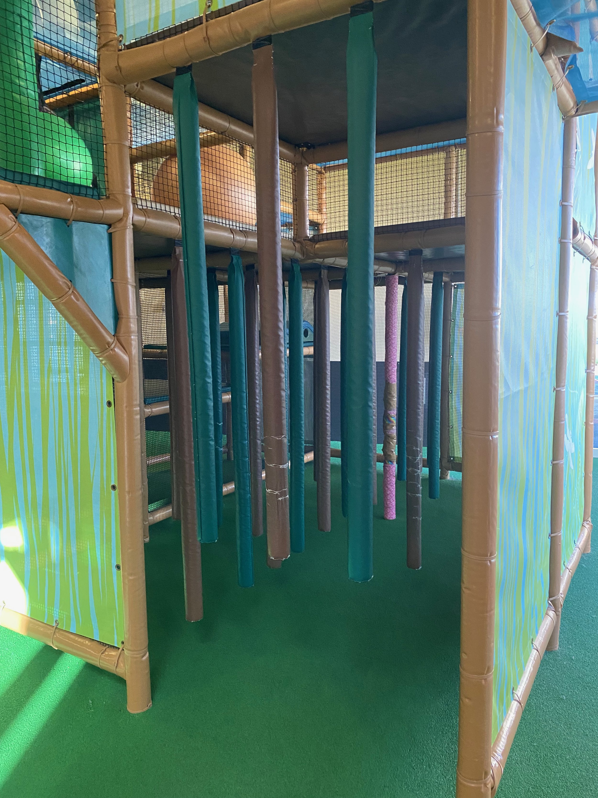The indoor space has a structure you climb into with tunnels and slides - like a nicer McDonald's play space if you know McDonald's. You'll find a pretend log to climb and some other features attached to the play structure for the kids to enjoy. Also, the ground is soft, and the ceiling-high for a spacious feel and good air circulation.