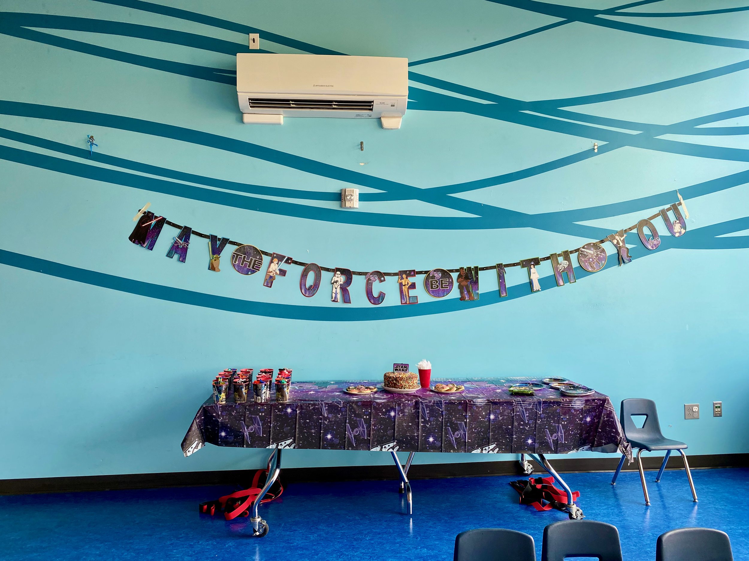 A few different rooms are available with various capacities (Zip, Zoom, and Tot-Trek) and prices for your event. We decided on the Tot-trek room that was $300. At the party, you get an hour of playtime in the Treetops indoor & outdoor space, then an hour in the room for cake, presents, and games. You get thirty minutes before and after for setup and clean-up as well. You are in charge of your own decorations and clean-up. The staff was accommodating, though, and did lend a helping hand. They also provided and set up the tables and chairs for the party.